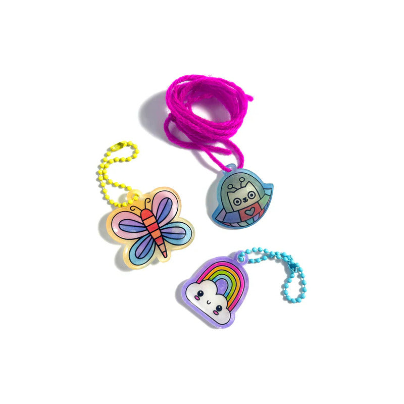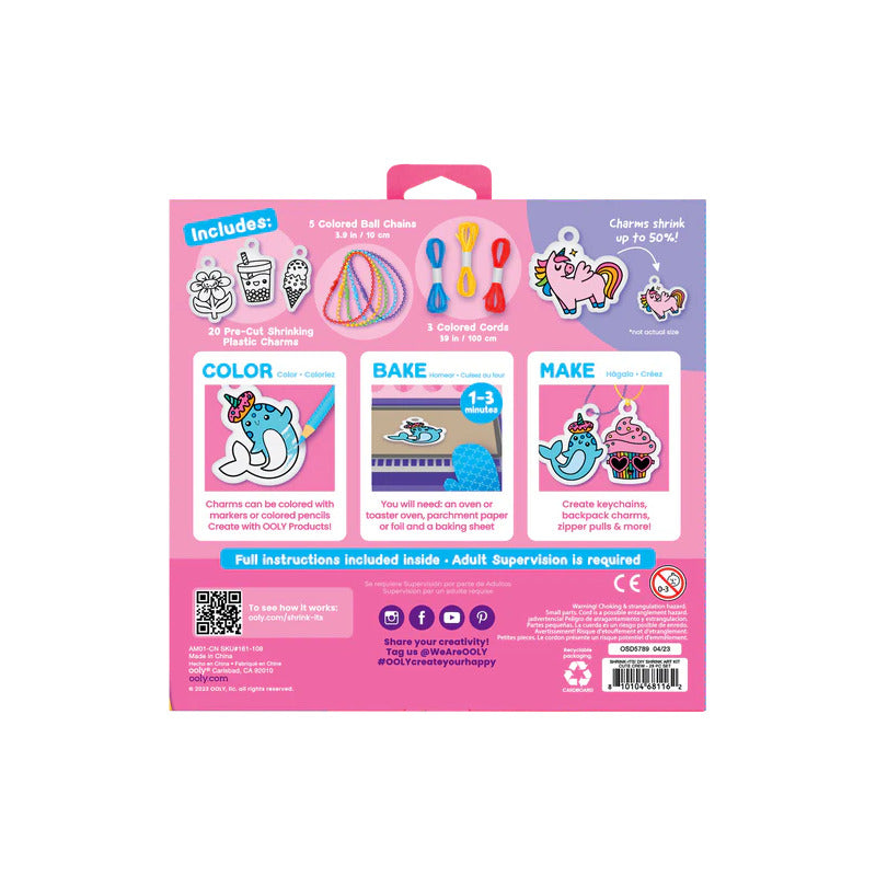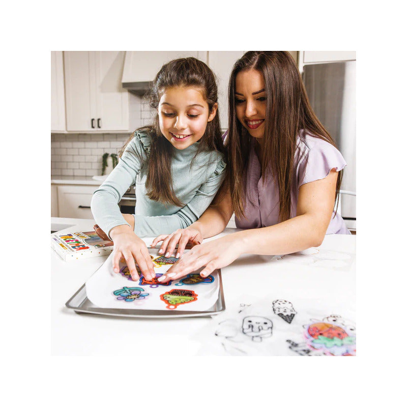 Incluye veinte dijes ligeros de plástico, como el helado sonriente, la dona gatita, la abeja feliz ¡y muchos más! Solo coloréalos con lápices de colores o rotuladores y hornéalos. Diviértete viéndolos encogerse en tan solo un minuto.