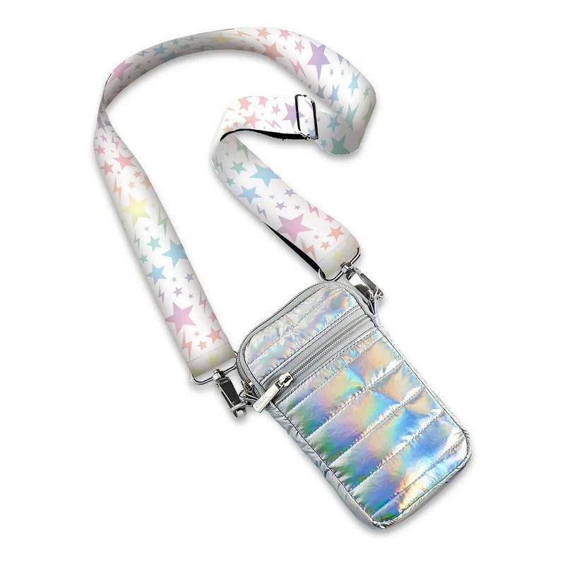 GUNMETAL. Bolsito Celular Para Niñas Correa Estrellas Iridiscentes
