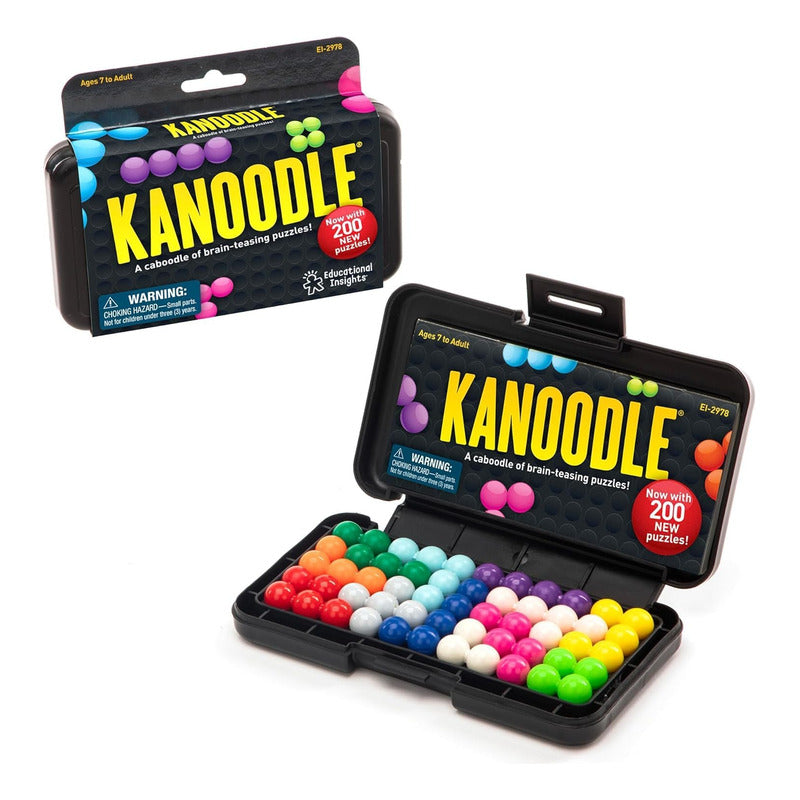 Sólo tienes que elegir un diseño de rompecabezas de la guía, seguir la configuración y resolver con las piezas restantes. ¡Sube de nivel de profesional a genio! Cuando hayas terminado, simplemente empaca las piezas dentro de la caja de bolsillo para que puedas hacer Kanoodle en cualquier momento y en cualquier lugar.
