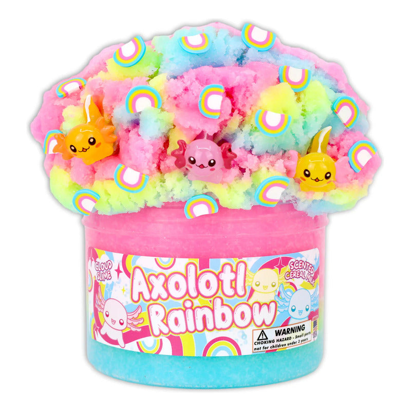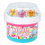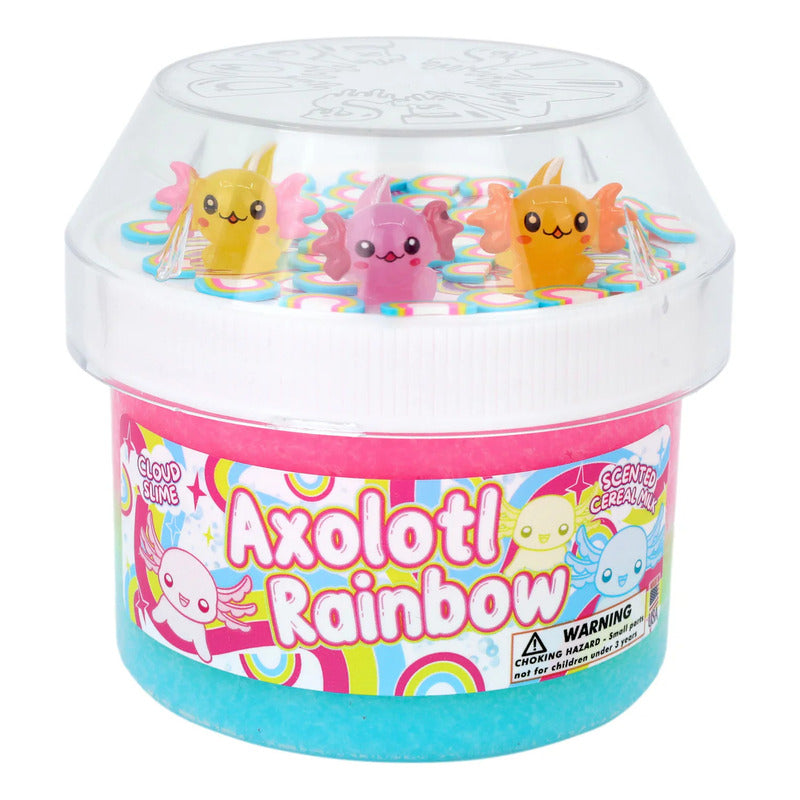 Axolotl Rainbow es un slime de nube, con masa viscosa suave y esponjosa de tres colores, con una vibrante mezcla de azul turquesa brillante, amarillo y rosa para mezclar. También incluye tres adorables colgantes de axolotl, fimos de arcoíris y perfumada con olor de cereal con leche.