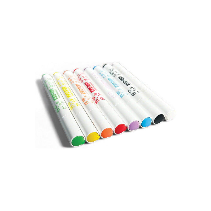 El set incluye ocho marcadores acrílicos en un arcoíris de colores brillantes. Estos marcadores multi superficie son ideales para pintar sobre piedras, madera, cartón y, por supuesto, ¡papel!