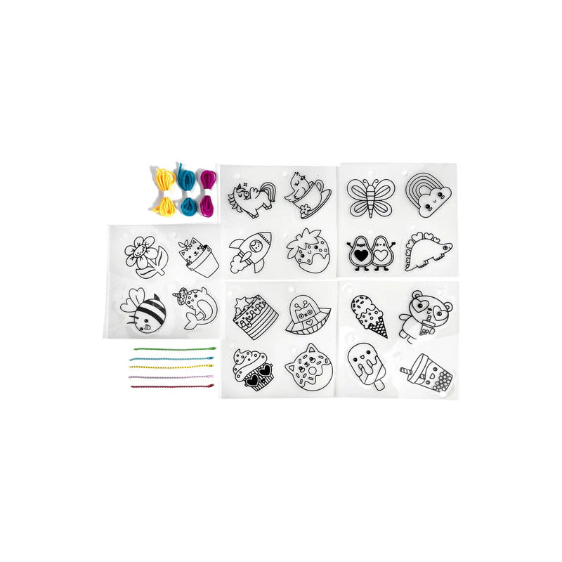 Incluye veinte dijes ligeros de plástico, como el helado sonriente, la dona gatita, la abeja feliz ¡y muchos más! Solo coloréalos con lápices de colores o rotuladores y hornéalos. Diviértete viéndolos encogerse en tan solo un minuto.