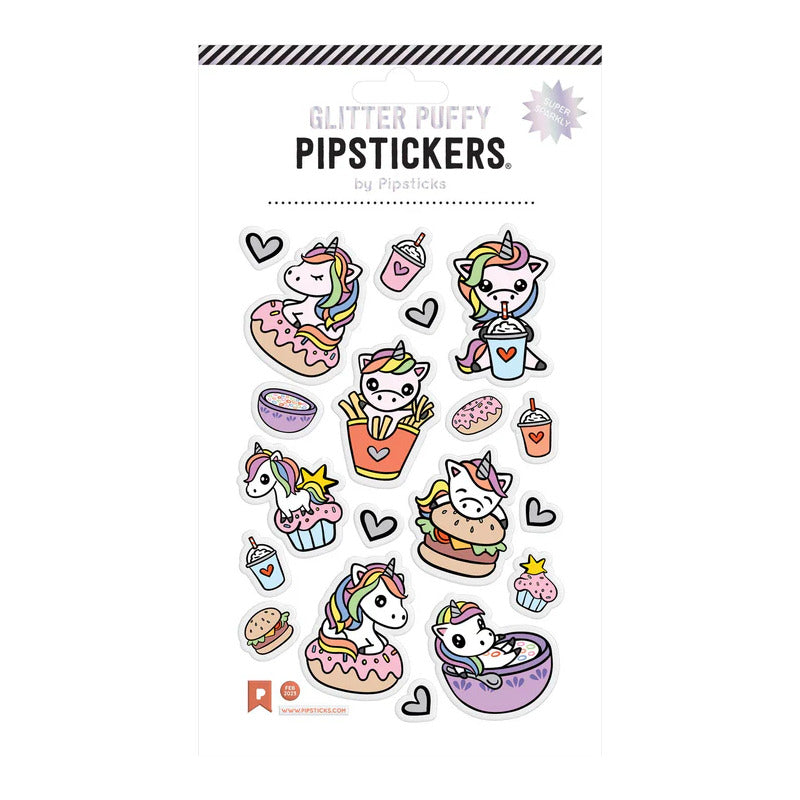 Incluye una hoja de Puffy Fast Food Fantasy PipSticker con detalles brillantes.