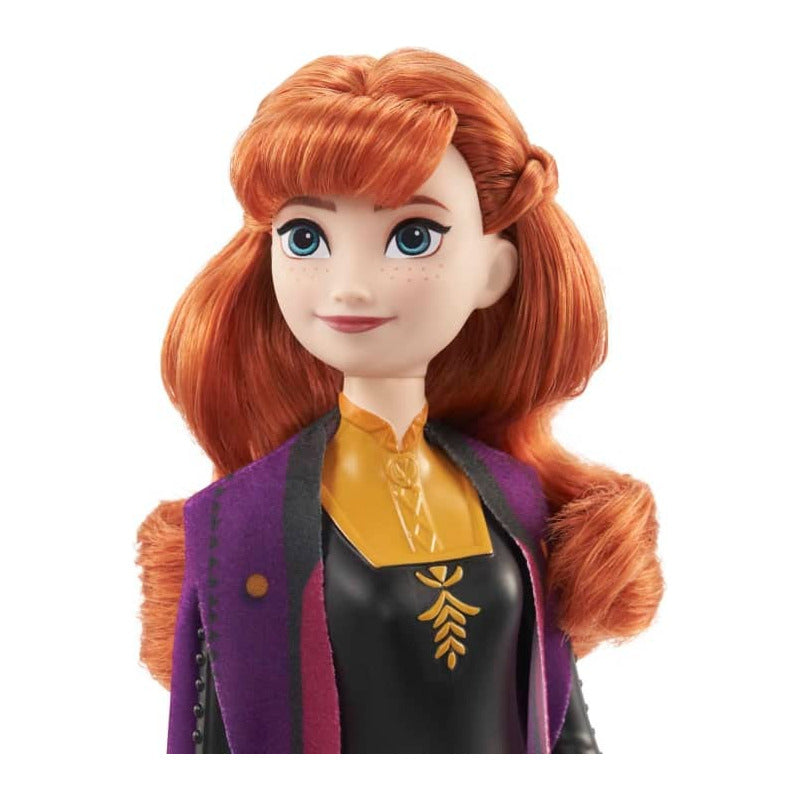 Esta muñeca Anna está inspirada en su personaje en Disney Frozen 2 con cabello largo y rojo, un atuendo de viaje y botas extraíbles.