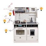 RR & Co. Cocina De Juguete Blanca en Madera Con Sonido y Luz RR & Co. 100% ORIGINAL Cocina de madera adaptada para niños y niñas, en color blanco y gris con LUZ y SONIDO Características: - Genial para aprender habilidades en la cocina - Robusta estructura de madera - Pintura no tóxica y ecológica - Gran espacio de almacenamiento - Fregadero extraible para una limpieza rápida y sencilla. - Girar perillas - Paquete plano (debe ensamblarse) - Fácil montaje - Se recomienda la supervisión de un adulto en todo momento. - Edad recomendada: a partir de 3 años - Certificación europea EN71 sobre seguridad de los juguetes Especificaciones: Material: madera maciza y MDF. Dimensiones totales: 65 cm x 30 cm x 93 cm Cuidado del producto: Limpiar con un paño seco de vez en cuando Requiere: ======================================