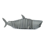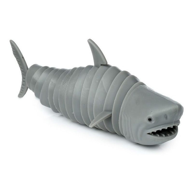 Con un cuerpo de secciones de cúpula articulada en tonos grises, aletas y una cara. Cuando doblas, sacudes o retuerces el cuerpo del tiburón, se escuchan pequeños chasquidos divertidos.
