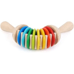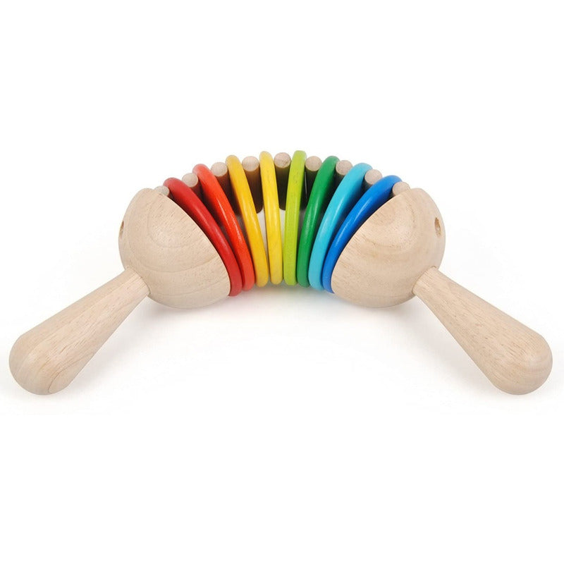 ¡Un maravilloso primer instrumento para pequeños! Tome los extremos del traqueteo y mueva ambas manos hacia arriba y hacia abajo en direcciones opuestas. Dependiendo de su velocidad, puede pasar de producir suaves sonidos de traqueteo ondulante a crear un bullicioso crescendo de traqueteo.