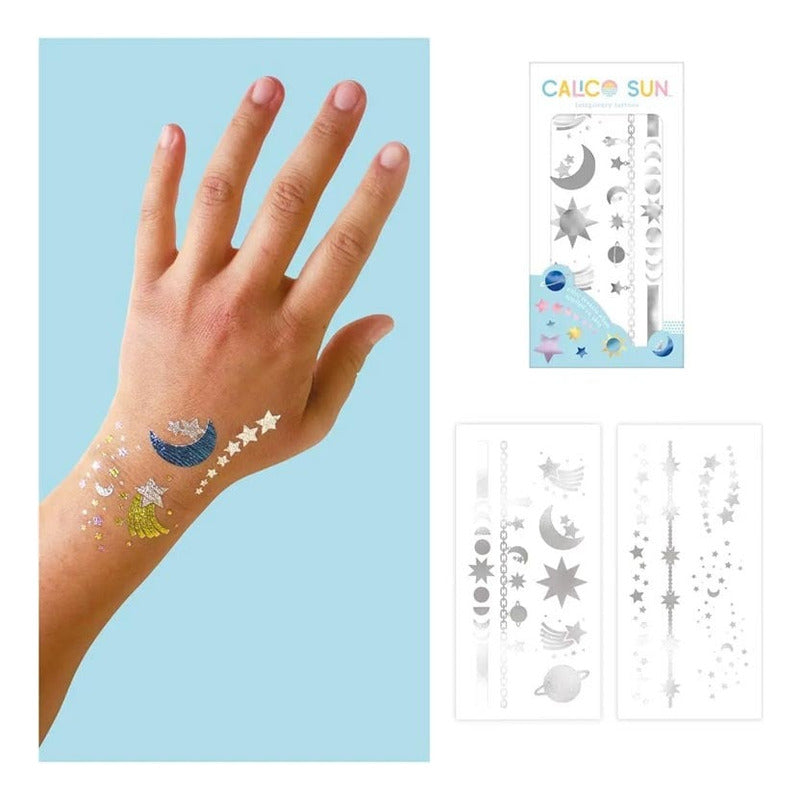 OOLY. Calico Sun Tattoos Temporales Luna (6pk) OOLY 100% ORIGINAL Exprésate con estos tatuajes temporales inspirados en la noche. Evocan un esplendor tranquilo e incluyen todo lo que amamos de una hermosa noche: una luna creciente, estrellas fugaces, planetas lejanos y más. Y aunque en el paquete parecen ser tatuajes temporales de color plateado, una vez que los aplicas en tu piel, ¡observa cómo aparecen mágicamente los colores llamativos! ------------------------------------------------------------ ------------------------------------------------------------