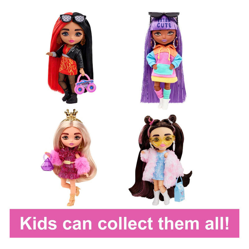 Conoce a las muñecas más pequeñas EXTRA: las Barbie® Extra Minis™. Son como las muñecas Barbie® Extra exageradas, ¡pero miniaturizadas! Posables y juguetonas en looks hechos para matar, estas muñecas de 8,3cm son mini con personalidades y estética de gran tamaño.