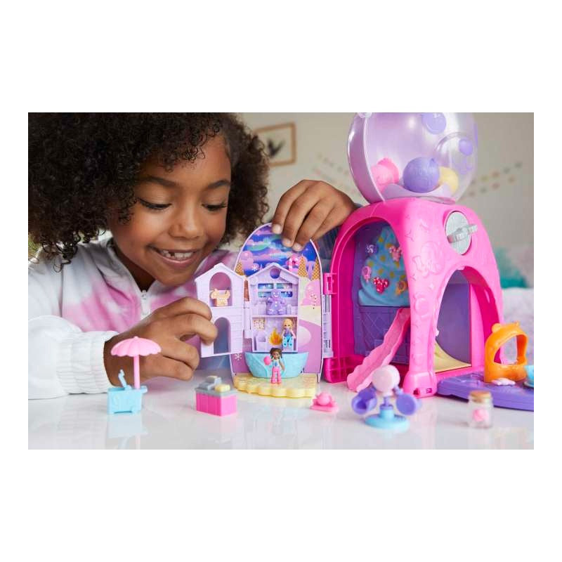 ¡Es una dulce diversión con el juego Polly Pocket™ Gumball Bear! Esta máquina de chicles cuenta con 4 espacios de juego y 32 piezas de juego en total (incluye muñecas micro Polly™ y Shani™, 6 chicles y más).