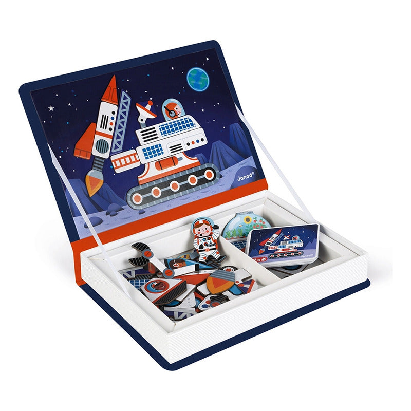 Este juego de cartón transportará a los niños a partir de 3 años al fascinante mundo del espacio y los planetas gracias a sus 52 imanes y 18 cartas. Dentro, una escena magnética sirve para recomponer el vehículo espacial que figura en la carta utilizando los imanes. El niño también puede divertirse mezclando las diferentes piezas entre sí para crear unas divertidas escenas, ya que son todas intercambiables.