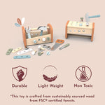 Construcción robusta: Hecho de madera duradera (certificado FSC), este banco de trabajo de caja de herramientas está construido para resistir el uso diario y llevar sus herramientas con facilidad.