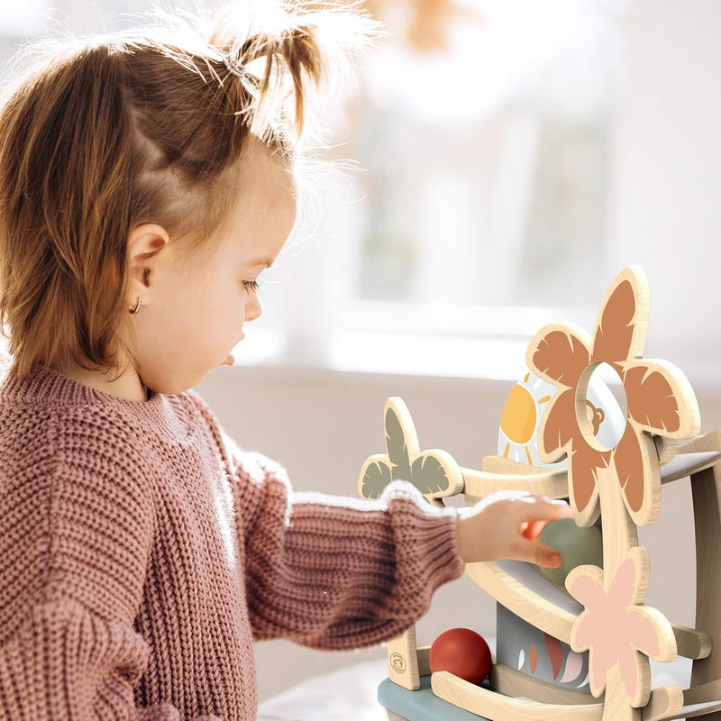 ¡Esta es una rampa de madera original en una decoración exótica que brinda horas de diversión! ¡A los más pequeños les encantará ver las tres bolas de madera rodar por la rampa y salir disparadas por la parte inferior! Atrápalos antes de que se caigan, ¡tendrás que ser rápido!