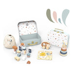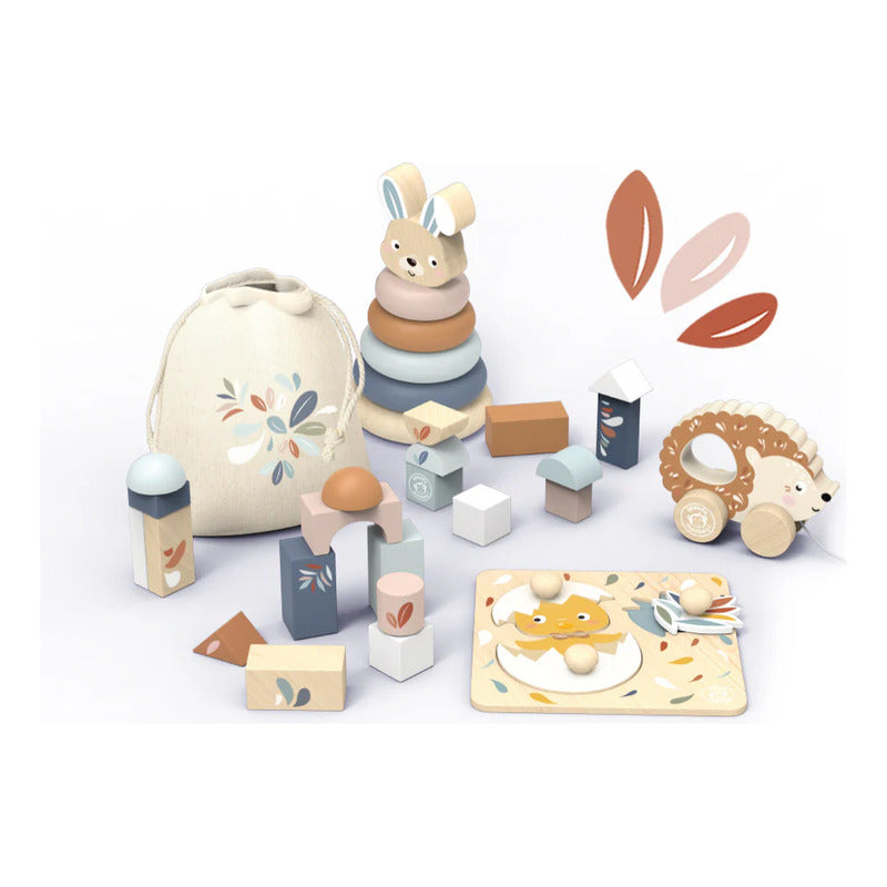 INCLUYE: bloques de construcción con bolsa de tela, conejo apilable, rompecabezas de pollito y erizo de arrastre.