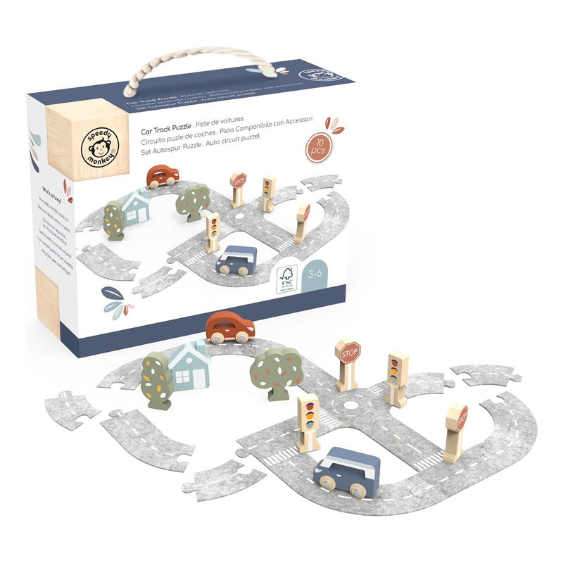 SPEEDY MONKEY. Rompecabezas Pista De Fieltro Para Automóvil + Accesorios Madera