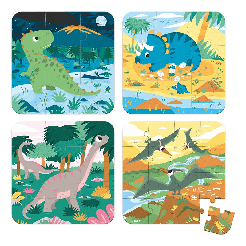 ¡Un viaje prehistórico espera a tus pequeños exploradores! Con estos 4 puzzles evolutivos sobre el tema de los dinosaurios, los niños a partir de 2 años empiezan a explorar el Jurásico.