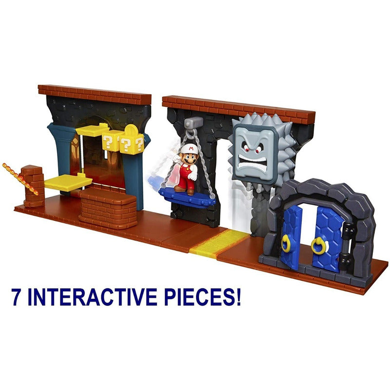 El juego de calabozo de lujo te permite reproducir este nivel clásico de los videojuegos de Super Mario. Puedes recrear el juego utilizando la figura de Mario de 6.35 cm incluida y navegar a través de varios obstáculos.