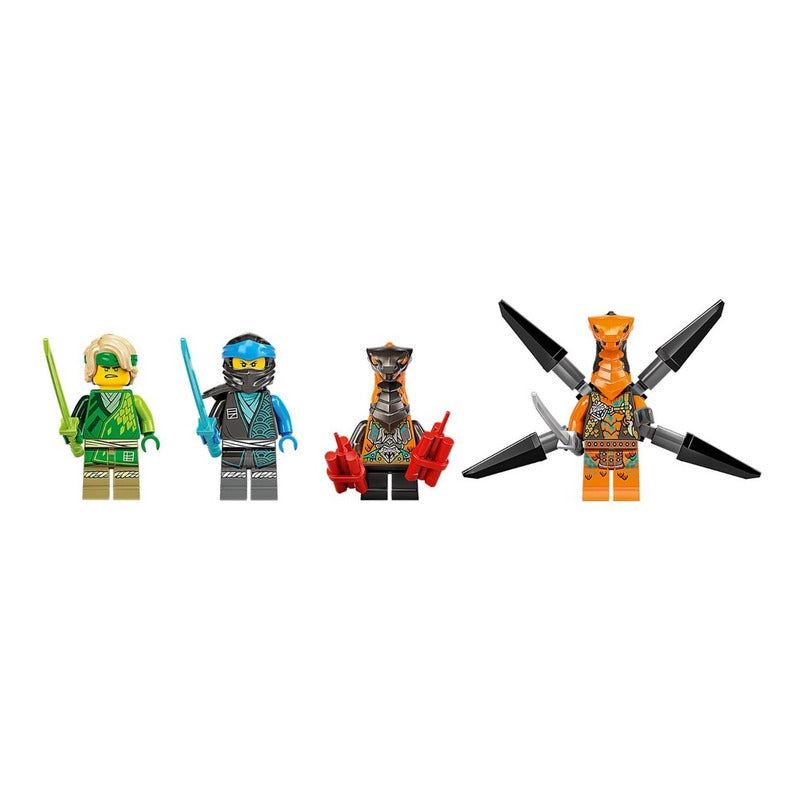 Incluye 4 minifiguras: Lloyd con una espada (además de una capucha que completa su equipo), Nya con una lanza, Viper Flyer con una mochila propulsora y una espada, y Python Dynamite con un cartucho de dinamita y una ballesta.
