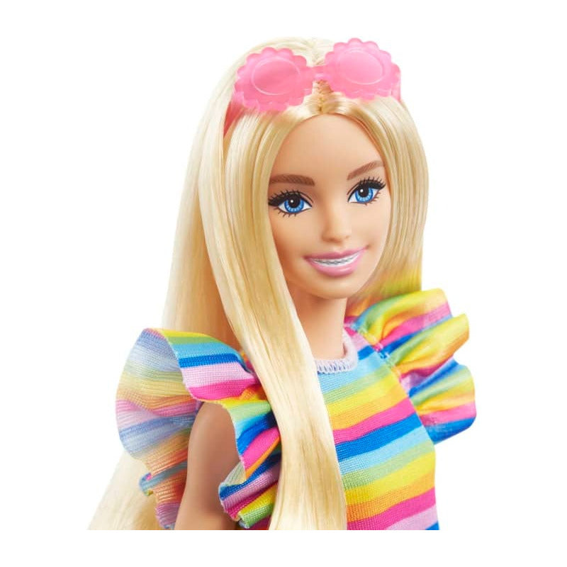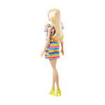 Barbie La muñeca tiene una forma original del cuerpo y lleva un adorable mameluco con un patrón de prisma multicolor combinado con tenis de cuña amarilla.