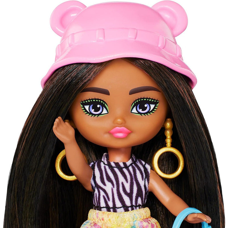 Esta muñeca Barbie Extra Mini Minis está lista para vivir aventuras en el safari con su pelo extralargo, una camiseta con estampado de cebra y unos pantalones con estampado de leopardo de los colores del arcoíris