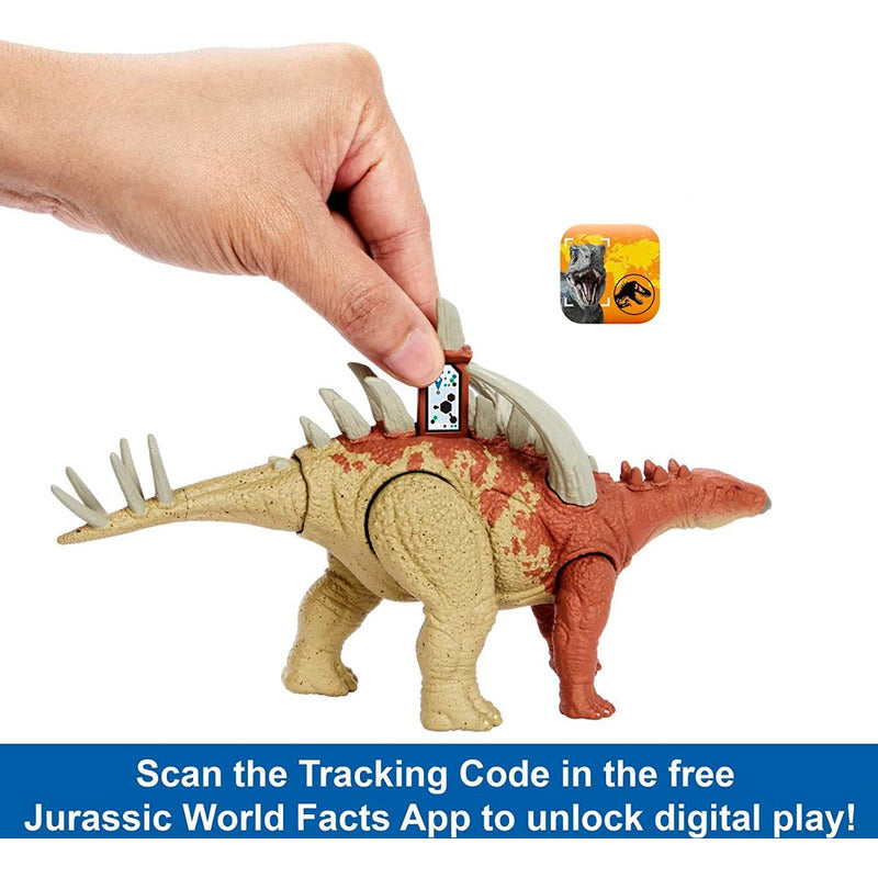 Escanea el código de seguimiento oculto de tu dinosaurio en la aplicación gratuita Jurassic World Facts con un dispositivo inteligente compatible (no incluido) para iniciar actividades y juegos de REALIDAD AUMENTADA.
