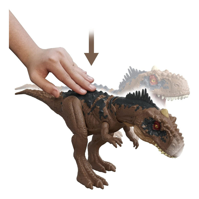 Jurassic World Dominion trae nuevas emociones y aventuras a los amantes de los dinosaurios. Con aproximadamente 33 cm de largo, esta figura de Rajasaurus de Roar Strikers inspirada en la película ampliará la definición de diversión de dinosaurios