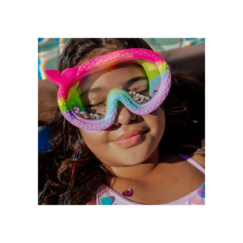 Con nuestra distintiva máscara de natación de doble lente llena de purpurina arcoíris flotante , esta máscara crea un aura verdaderamente mística.