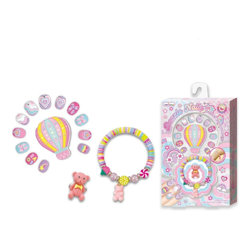 Contiene: 12 uñas postizas, 1 pulsera con dije, 1 anillo ajustable y 1 lima de uñas.