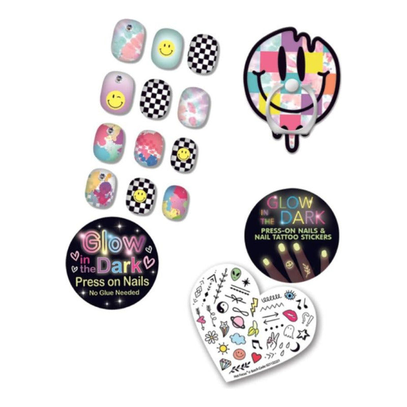 Todas las jóvenes a la moda apreciarán lo increíble que es este set. Incluye una lámina de tatuajes luminosos, un juego de 12 uñas postizas y un soporte para el teléfono.