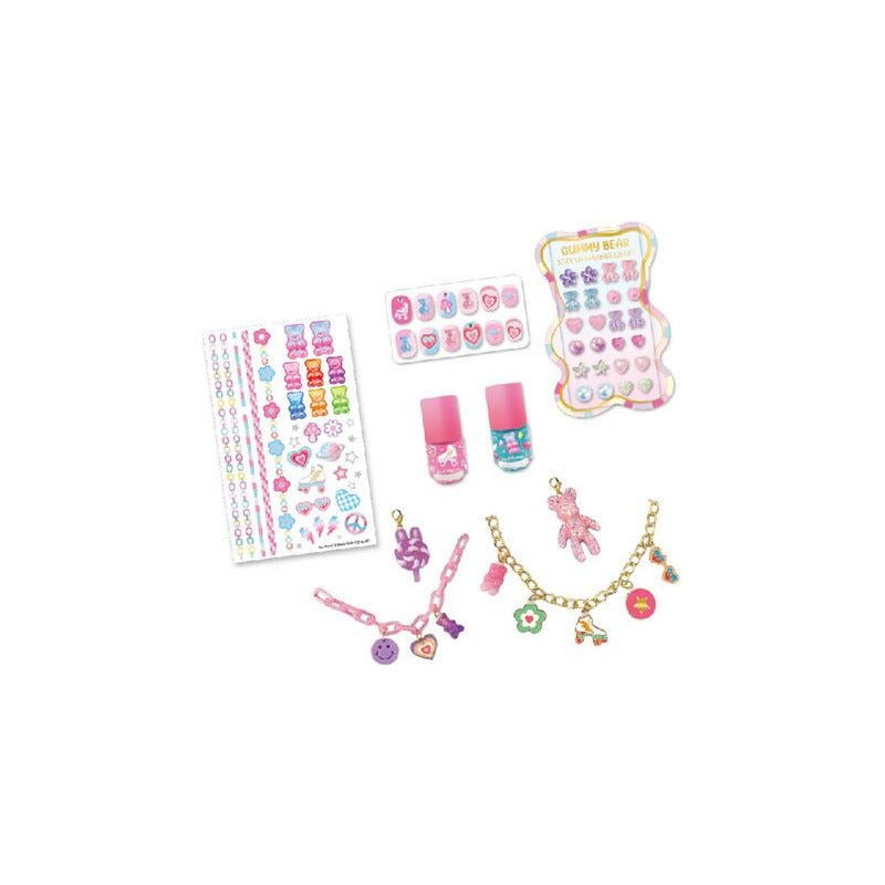 Un kit de accesorios inspirado en los Gummy Bears, con esmalte de uñas, uñas postizas, tatuajes para dedos, dijes y aretes que le encantarán a tu peque.
