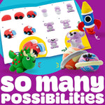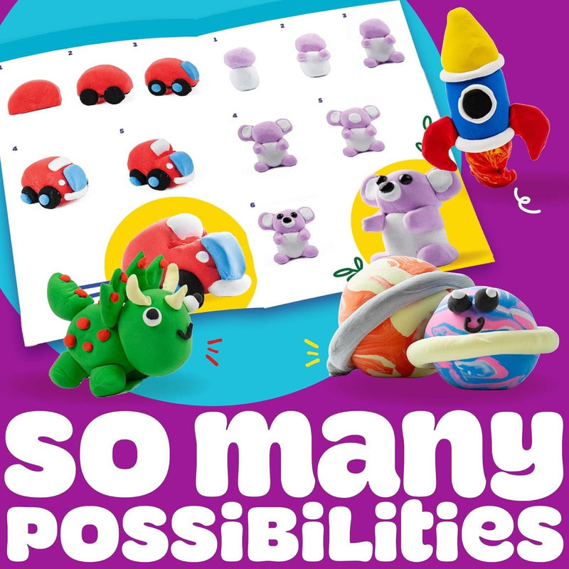 ¡Esculpe cualquier cosa que imagines, alísala y crea algo nuevo! Deja que tus creaciones se sequen al aire, luego transfórmalas con pintura, o saltea el secado y disfruta de una diversión abierta mezclando y combinando con contenedores sensoriales o tu slime favorito.