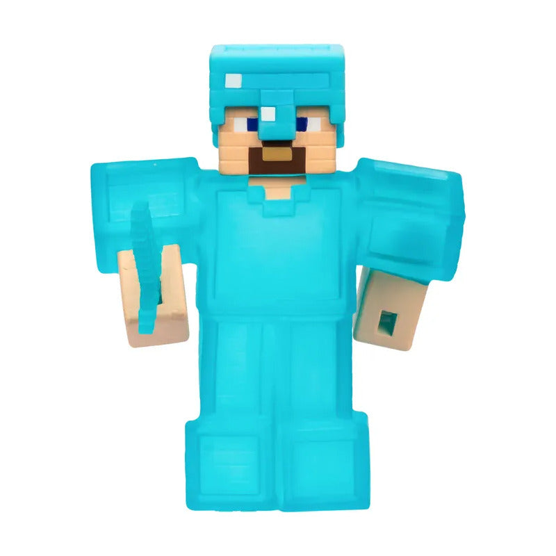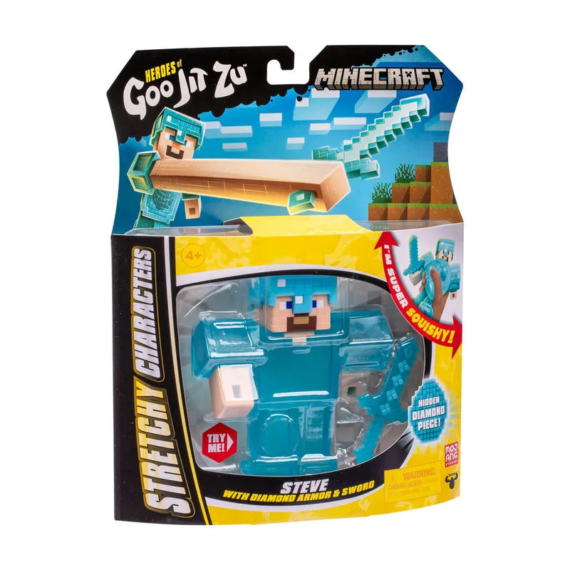 ¡Minecraft ha unido fuerzas con los Héroes de Goo Jit Zu para convertirse en figuras elásticas, crujientes y blandas! ¡La figura de Steve con armadura de diamante y espada de Minecraft tiene un relleno de sustancia viscosa súper blanda y único!