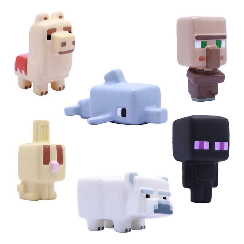 Colecciona los 6 personajes, incluyendo una llama, un conejo, un oso polar, un delfín, un enderman y un aldeano.