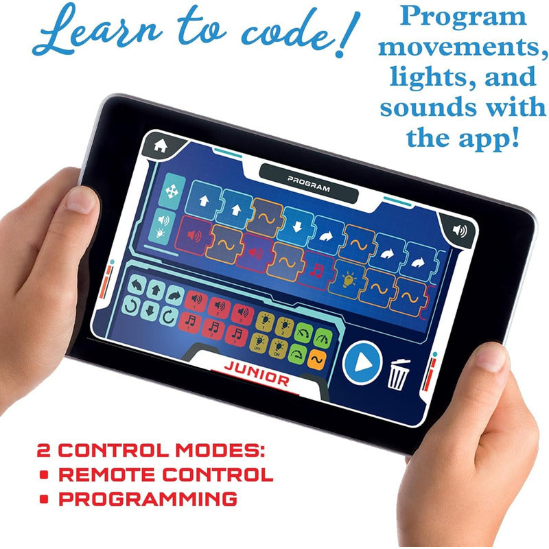Una vez que Junior es construido, los niños pueden programar sus movimientos en el teclado incorporado o descargar un aplicación gratuita (Android o iOS) para desbloquear todas sus capacidades.