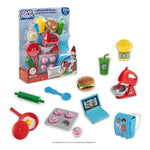 Este kit INCLUYE: una mochila, una computadora portátil, un vaso con pitillo, una batidora de pie, un rodillo, una cuchara, una cacerola y comida en miniatura como una hamburguesa con queso, papas fritas, un huevo frito, una bandeja para hornear con pastelitos y más.