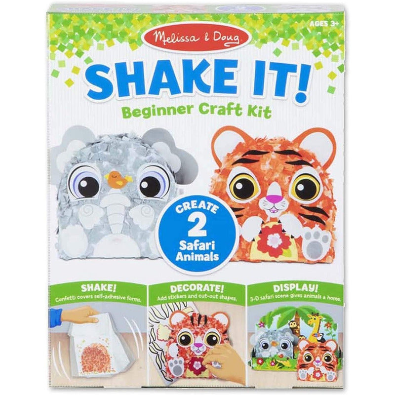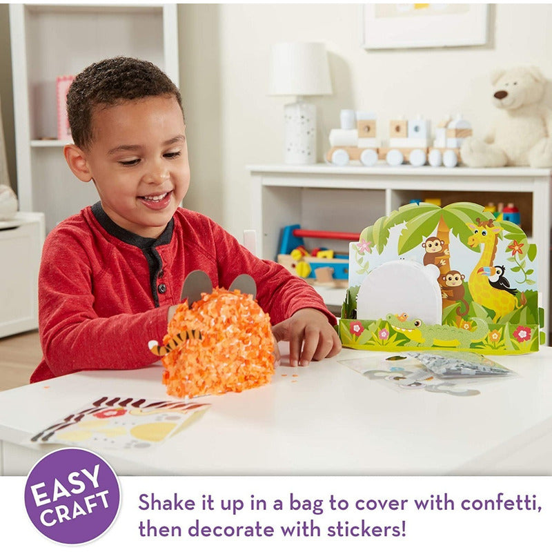 Kit de manualidades para principiantes con diseño de animales de safari cubiertos de confeti; despega para revelar una superficie pegajosa, cae en una bolsa de confeti y agita para cubrir.