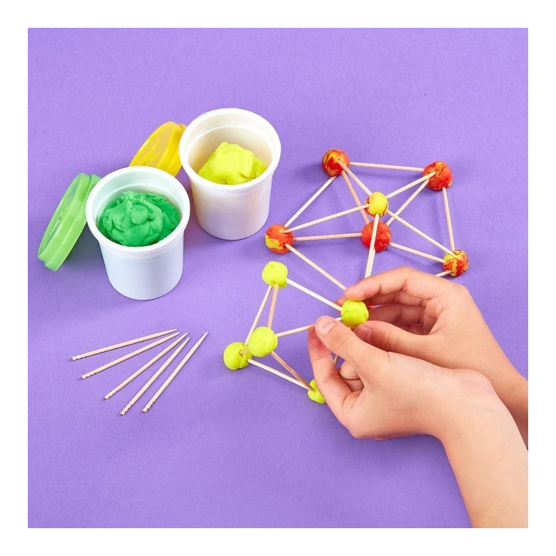 Construye tus propias esculturas de masa conductora con divertidas cabezas, brazos y piernas de cartón. ¡Aprende cómo fluye la electricidad y enciéndelos! ¡Es tan fácil y divertido! Haz tu propia máquina de ondas para ver cómo la luz y el sonido viajan en el mismo patrón. Esculpe formas geométricas con palitos y masa.