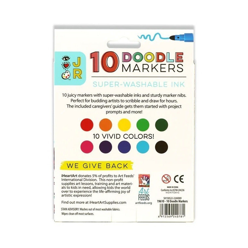 I HEART ART. Junior - Marcadores Super Lavables (10pk) BRIGHT STRIPES. 100%ORIGINAL Prepárate para dibujar, garabatear y garabatear con los marcadores perfectos para los más pequeños. Estos marcadores Doodle tienen el tamaño perfecto para manos pequeñas. ¡Los marcadores cuentan con puntas extra resistentes para los garabatos más entusiastas y enérgicos! No te preocupes mamá, estas 10 tintas de colores brillantes están hechas con una fórmula súper lavable! La colección iHeartArt JR es de materiales de arte de alta calidad hechos especialmente para niños pequeños de 3 a 5 años. ***iHeartArt dona el 5 % de sus ganancias a su socio benéfico, Art Feeds, que brinda lecciones de arte, capacitación y materiales de arte a niños necesitados. ------------------------------------------------------------ ------------------------------------------------------------