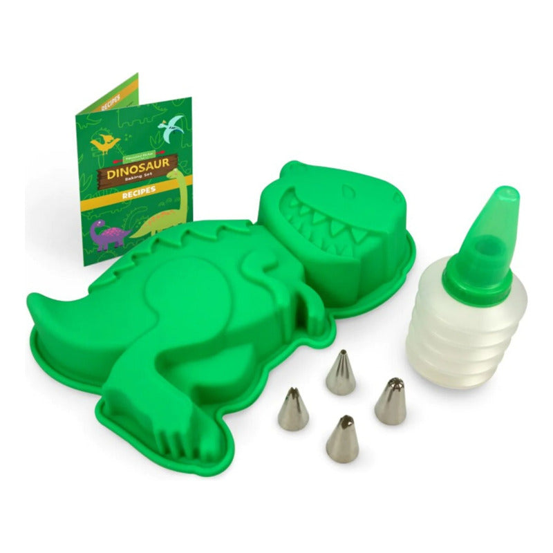 El kit de horneado de 7 piezas para uso real en la cocina incluye: 1 molde grande de silicona para pastel de dinosaurio, 1 envase de glaseado con 4 puntas y folleto de recetas.