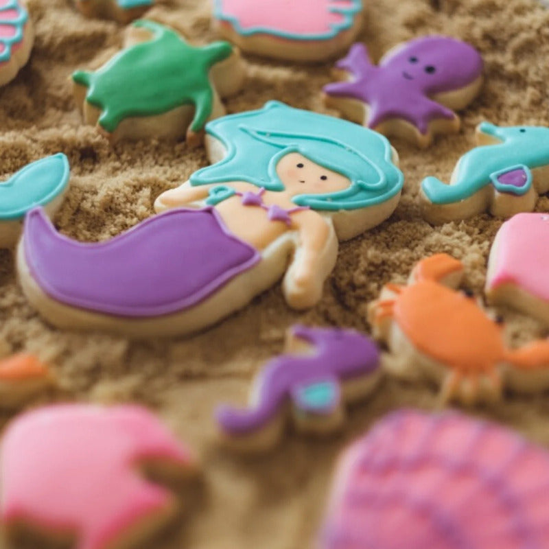 ¡Disfruta de océanos de diversión cada vez que hornees con nuestro gran juego de cortadores de galletas! El juego de 10 piezas para uso real en la cocina presenta divertidos cortadores inspirados en el mar en varios tamaños.