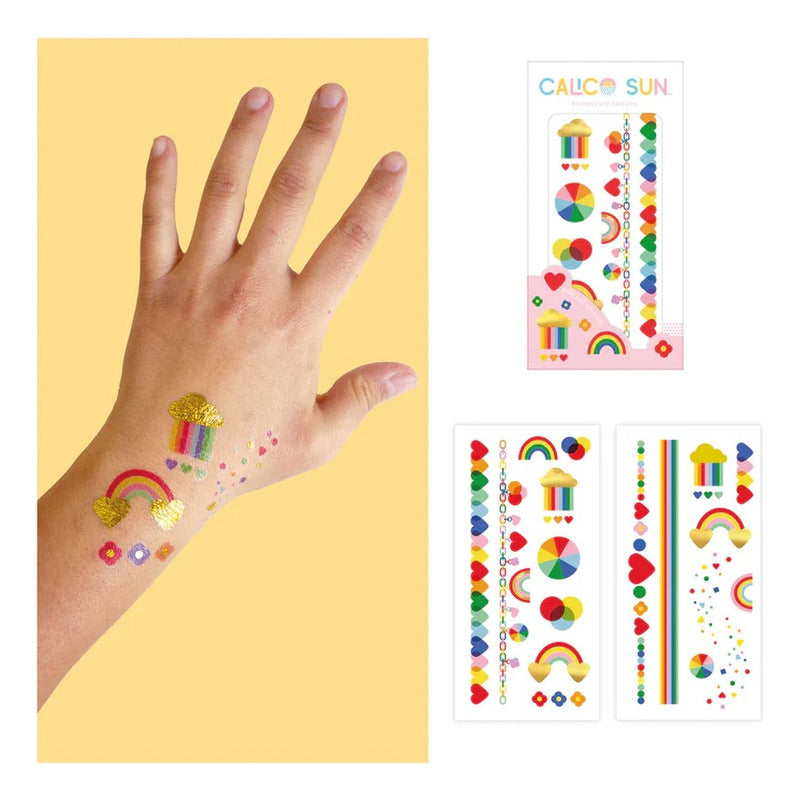 OOLY. Calico Sun Tattoos Temporales Violeta (6pk) OOLY 100% ORIGINAL Dale un toque especial a tu armario con los tatuajes temporales violeta. Cada paquete contiene dos hojas de tatuajes temporales con arcoíris, corazones y una variedad de formas, con un tratamiento de lámina de oro. Perfectos para complementar tu atuendo o agregar a una bolsa de regalos para una fiesta de cumpleaños, estos tatuajes temporales hacen una declaración audaz con sus colores vibrantes y símbolos de positividad. Un regalo de fiesta ideal, son adecuados para mayores de 3 años. ¡Deja que el mundo conozca tu actitud positiva y haz sonreír a todos! ------------------------------------------------------------ ------------------------------------------------------------