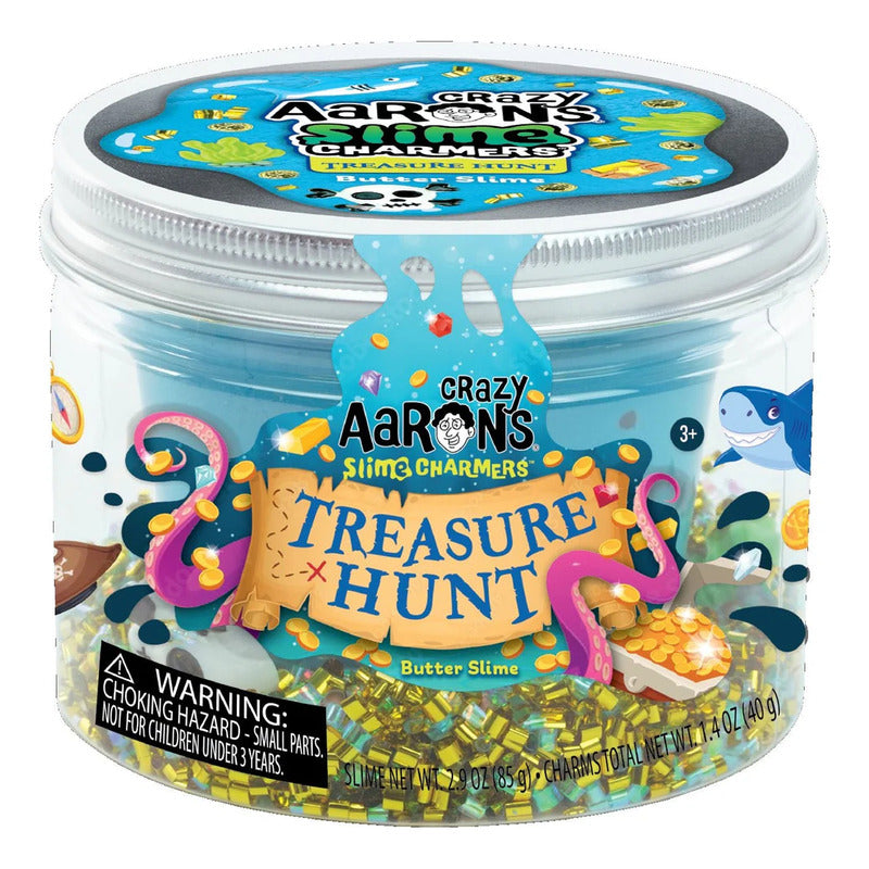 ¡Embárcate en una aventura con Crazy Aaron’s® Treasure Hunt Slime Charmers™! Esta suave masa viscosa azul con aroma a coco está repleta de bolitas doradas de bingsu y amuletos de tesoro escondidos esperando ser descubiertos. ¡Excava en la masa, descubre tus tesoros y que comience la diversión!