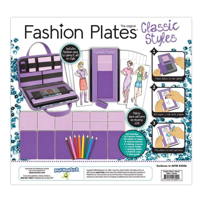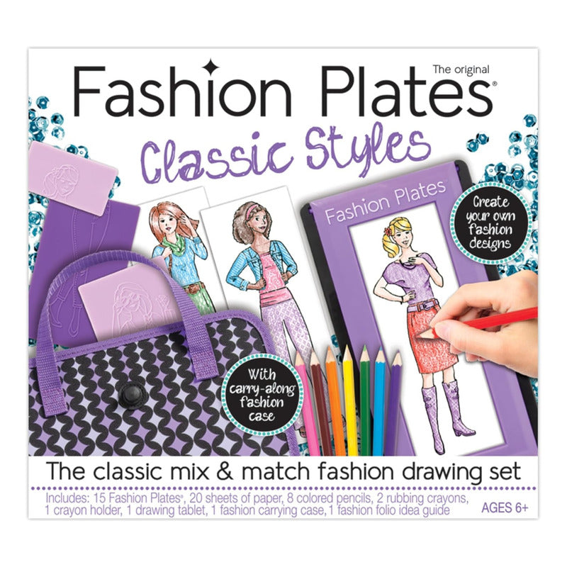 El kit de manualidades y artes de Fashion Plates Classic Styles viene en un elegante estuche de transporte, lo que lo convierte en el juguete de viaje perfecto para viajes en automóvil y actividades de avión para niños.