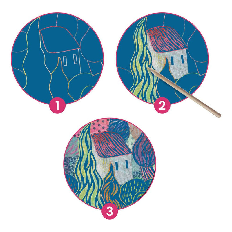 Contenido: 4 tarjetas para rascar (20 x 20 cm), 1 lápiz de madera de doble punta,
