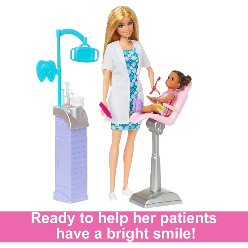 BARBIE. Dentista MATTEL 100%ORIGINAL Pasa para un chequeo y prepárate para alegrar sonrisas con la muñeca Barbie Dentista. Este juego viene con 2 muñecas, una estación dental, silla para pacientes y accesorios más pequeños como herramientas dentales, cepillo de dientes y pasta de dientes. Guarde los accesorios en los estantes de la estación dental. Para un juego de rol realista, las piezas realmente encajan en las manos de la muñeca. Vestida con su abrigo blanco, la muñeca Barbie Dentista está lista para cuidar a su adorable paciente pequeño. Los niños pueden jugar como médicos y pacientes para divertirse en contar historias. El juego de muñecas y accesorios es un gran regalo para niños de 3 años en adelante, especialmente aquellos que sueñan con estar en el campo médico. ------------------------------------------------------------ ------------------------------------------------------------