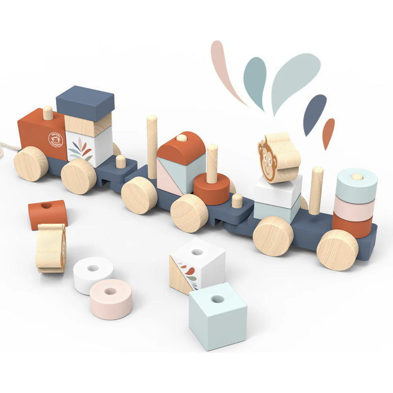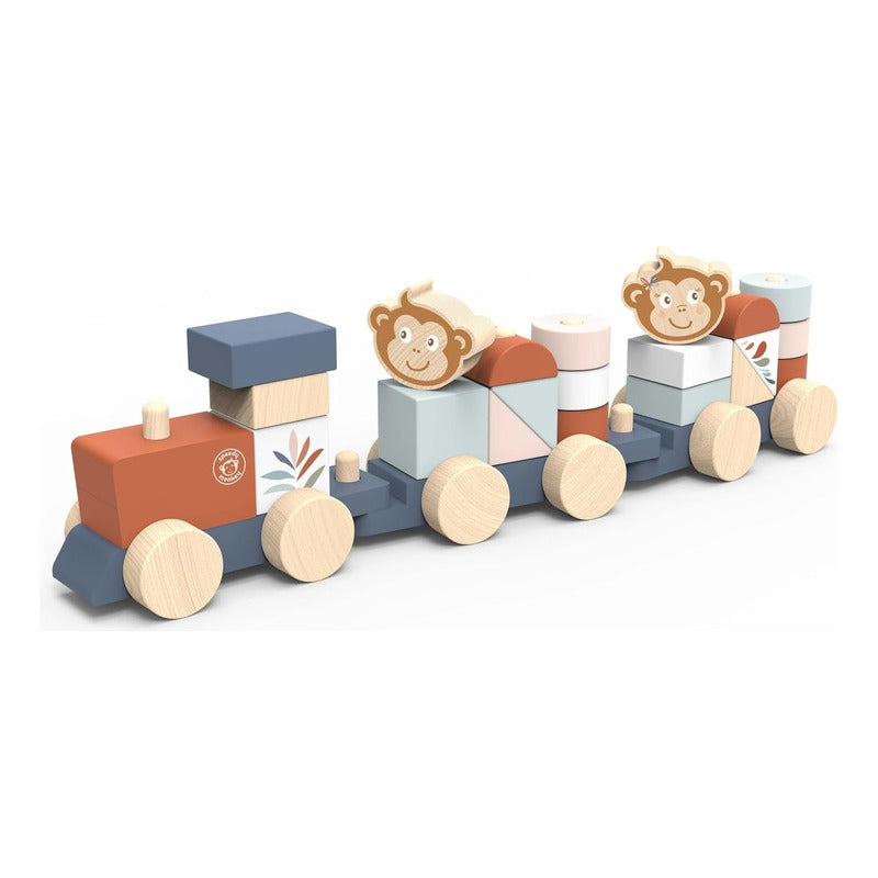 Un divertido apilador de trenes de madera, pintado en colores suaves de moda y con nuestro personaje favorito, el mono. Tu pequeño tendrá horas de diversión, apilando elementos en el tren y construyendo casas con bloques de colores.