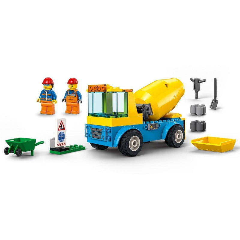 Incluye: Todo lo que los peques necesitan para construir el Camión Hormigonera LEGO® City, además de una carretilla, un martillo neumático y una señal de obras en carretera de juguete, y también 2 minifiguras de obreros