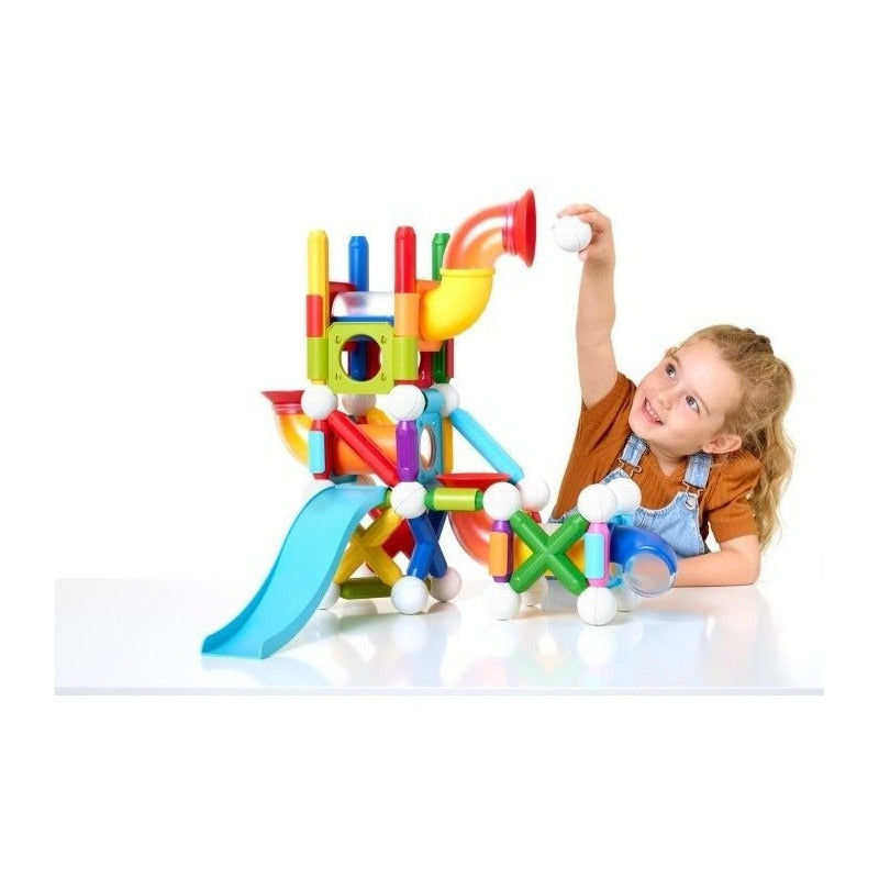 EL SET INCLUYE: 71 piezas coloridas con barras resistentes, bolas, tubos, conectores y un tobogán.