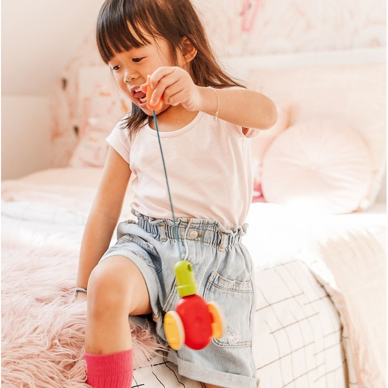 Combina piezas para crear todo tipo de trenes coloridos y tambaleantes.