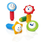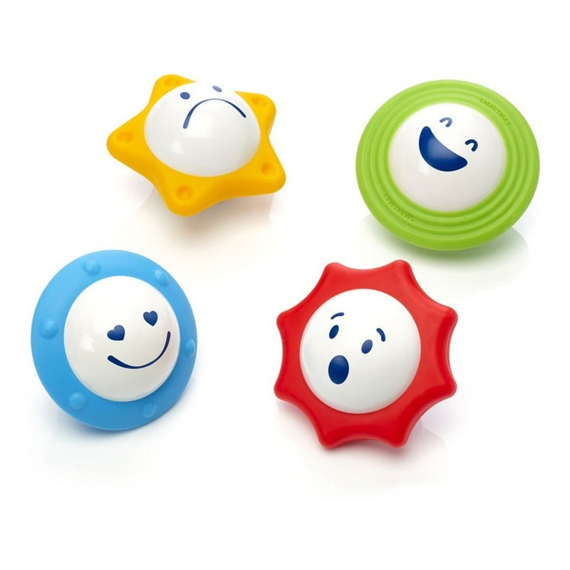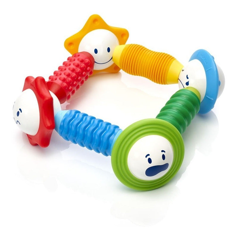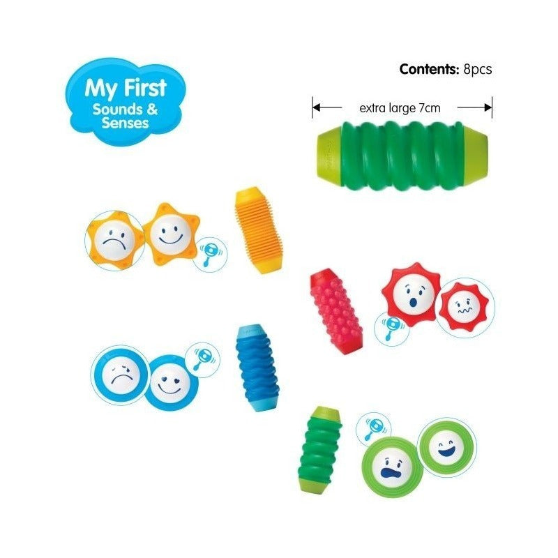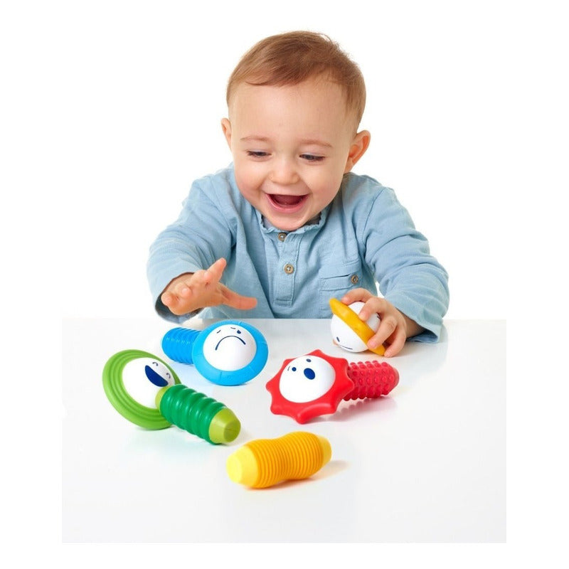 EL SET INCLUYE: 8 piezas coloridas, cuatro barras táctiles y cuatro pelotas con diferentes contornos y caras.